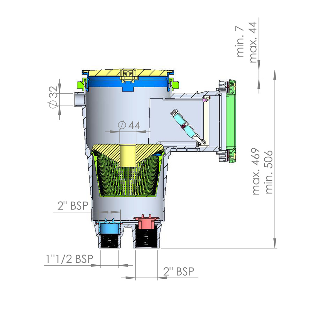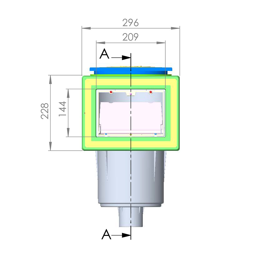 Levereras med självhäftande packningar, flänsar och skruvsats. Alla exponerade skimmerdelar är UV-beständiga. Rekommenderat flöde 7500 l/h. I vit ABS med tyst flödesreglerande plugg. Ø 50 mm. Bräddanslutning Ø 40 mm.