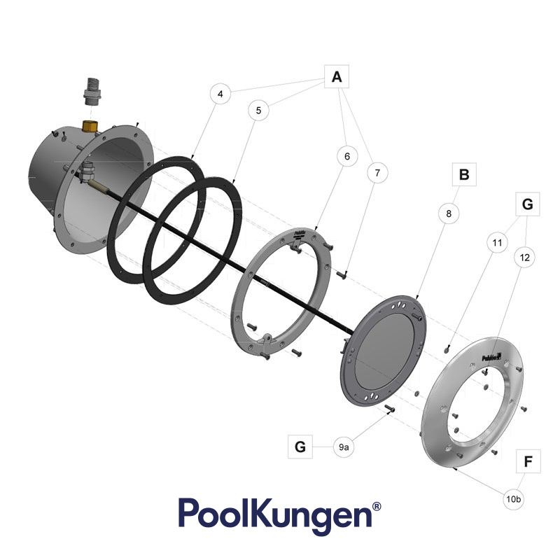 Vid byte av liner eller ljuskälla rekommenderar PoolKungen att man alltid byter packningar för att säkerställa en tät montering. Packningar och skruvsats finns i PoolKungens renoveringskit.