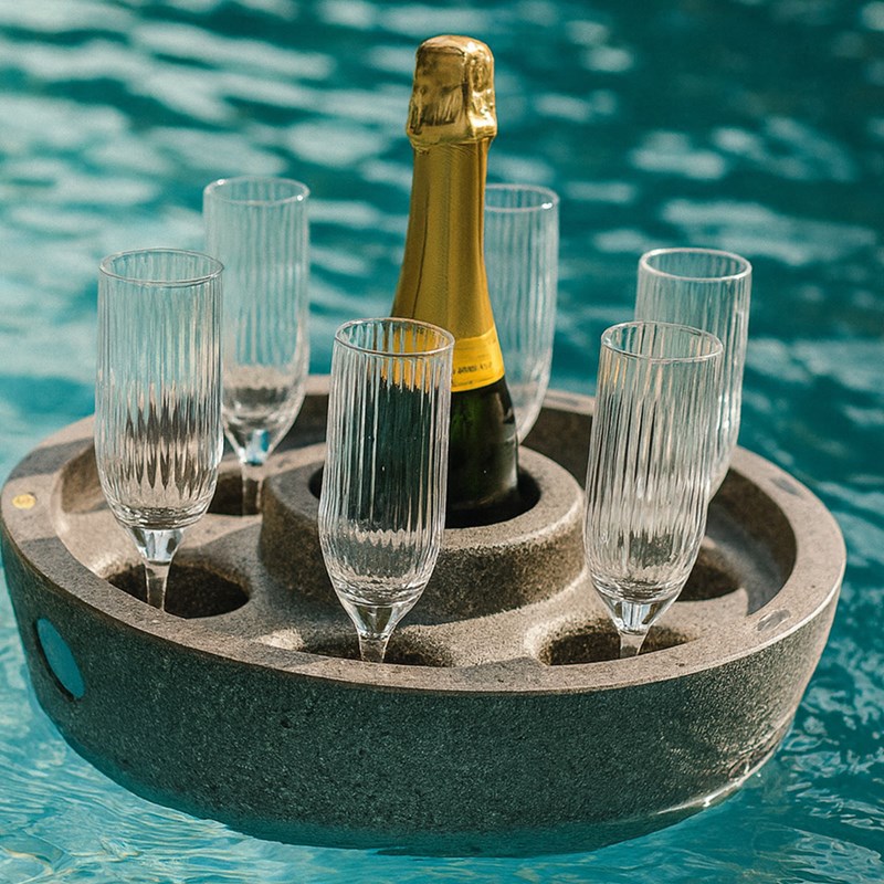 Servera stilfullt i poolen med flytande brickor, muggar och glas.