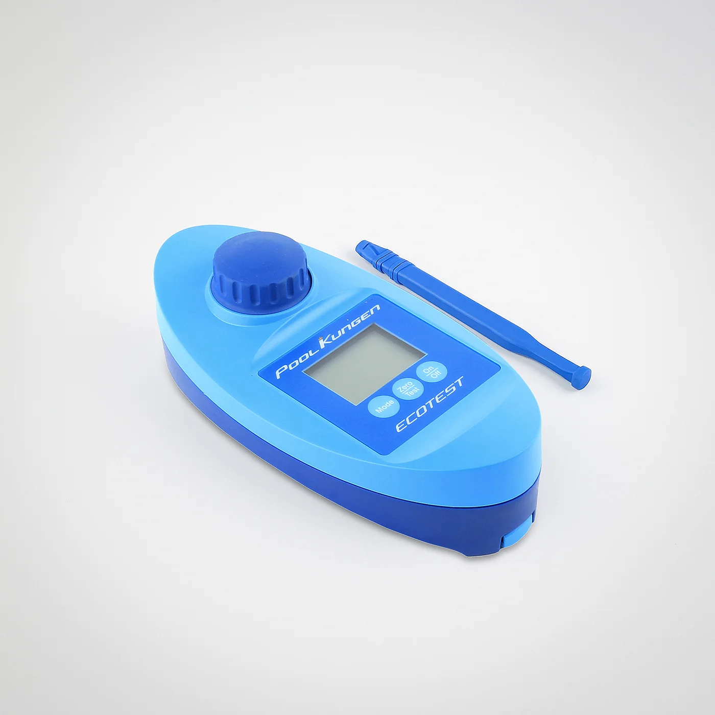 Mät klor, pH och alkalinitet med teststickor och digitala mätare för tryggt badvatten.