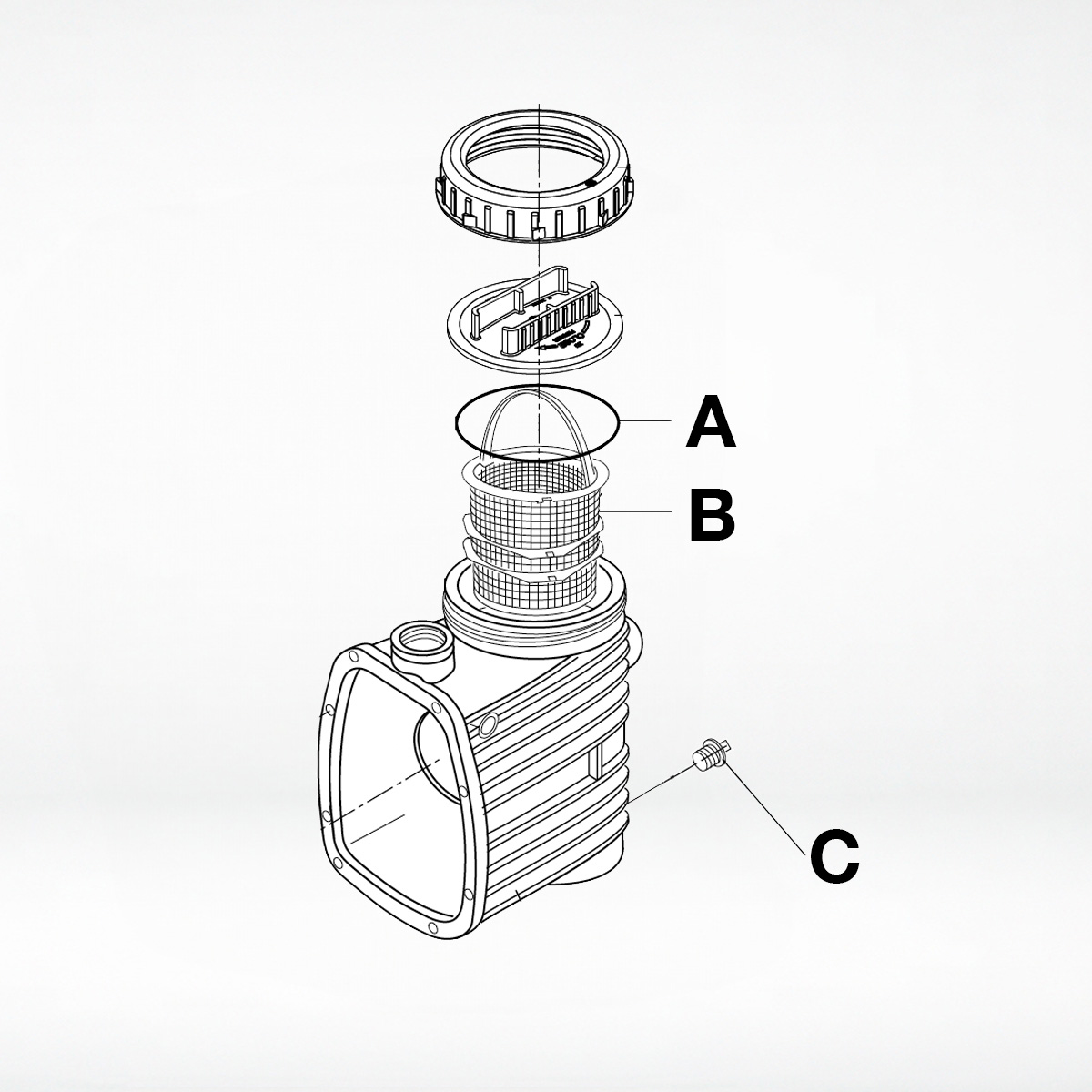 Reservdelskit till Superpump 8,12 och 14. I kitet ingår (A) O-ring för behållare för silkorg, (B) Silkorg och (C) dränplugg.