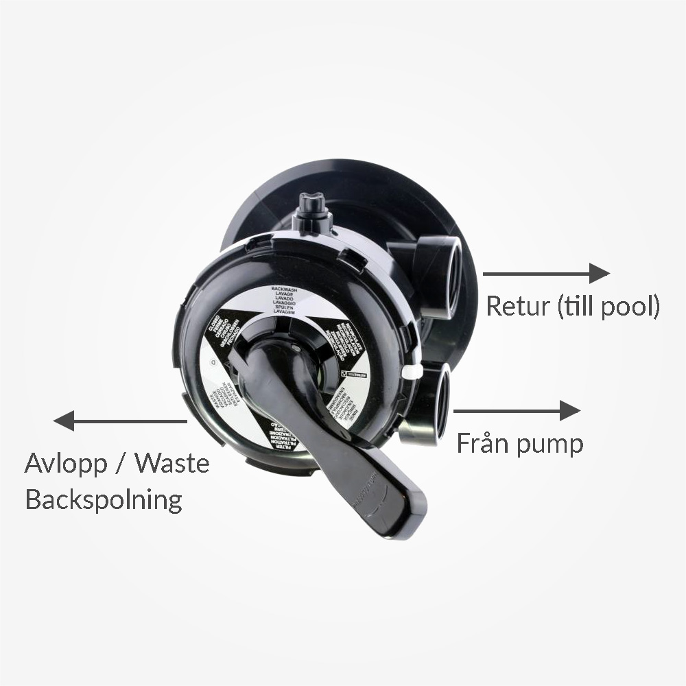 OBS! Tänk på att stänga av poolpumpen innan du ändrar läge på sexvägsventilen.