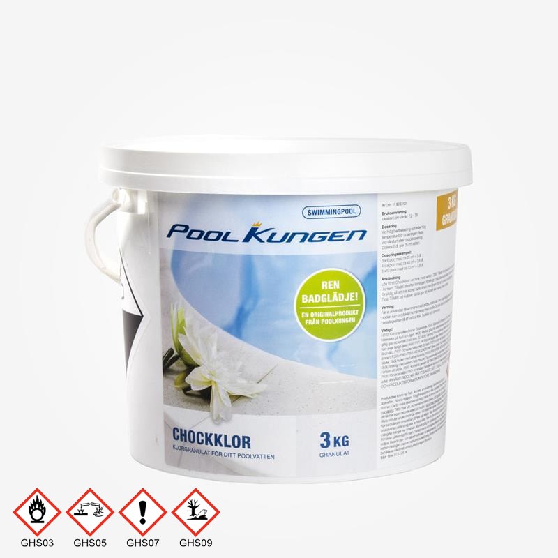 När du startar upp din pool, samt under hela badsäsongen är det viktigt att du med jämna mellanrum chockklorerar ditt poolvatten. Detta bryter ner oönskade bakterier och är perfekt att använda efter dagar med mycket bad för att kompensera för den ökade klorförbrukningen.