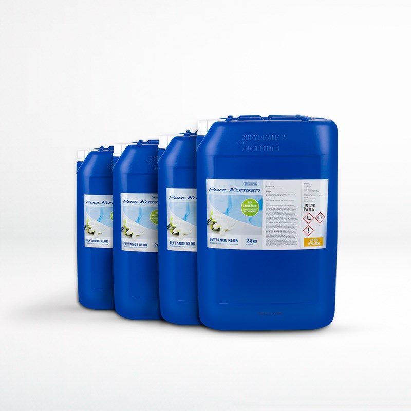 PoolKungen 4 dunkar flytande klor till pool - Hemleverans inkluderat Art nr 100623 Moms ingår med Flytande kvalitetsklor, färdigt paket direkt hem till dörren. Läs mer Kampanj! Lägg i varukorgen Finns i webblager. Leveranstid . Beställningsvara. Leveranstid . 4 dunkar flytande klor till pool - Hemleverans inkluderat Till toppen Produktinformation PoolKungens flytande klor för pool – anpassat för för automatiska doseringssystem PoolKungens flytande klor är anpassat för alla typer av pooler med klorautomatik, såsom Minimaster, MicroDos, Aseko, ControlStation och liknande system på marknaden. Vi erbjuder smidig hemleverans av fyra dunkar á 24 kg, direkt till din dörr – enkelt och bekvämt! Flytande klor för kristallklart vatten i poolen Vårt flytande klor är utvecklat för automatiska doseringssystem och doseras direkt från behållaren med hjälp av en doseringspump. Det verkar effektivt för att:✅ Bryta ner bakterier✅ Avlägsna smuts✅ Minska hälsorisker OBS! Blanda aldrig denna produkt direkt med andra kemikalier. Notera att särskilda regler gäller för ångerrätten på denna produkt eftersom den klassas som farligt gods. Vänligen ta del av våra ”Köpevillkor för webbshopen”.