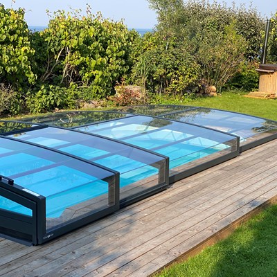 Ett pooltak skyddar din pool mot löv, smuts och försurat regnvatten när poolen inte används. Ni skjuter enkelt av ert  pooltak från poolen då alla våra pooltak är utrustade med automatisk sektionslåsning, vilket innebär att pooltaket öppnar och stängs snabbt och smidigt, då sektionerna har en automatisk låsfunktion.